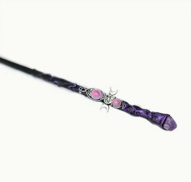 The Triple Goddess Wand features a black finish with a swirl of metallic purple winding around the base in tendrils. A leafy triple goddess charm and aura gems are embedded into the handle and a clear crystal rough is embedded into the end.