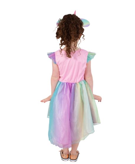 - Dress has a digitally printed graphic of Minnie riding a unicorn over a rainbow and the waistband is sequined with a glittery silver bow sewn on