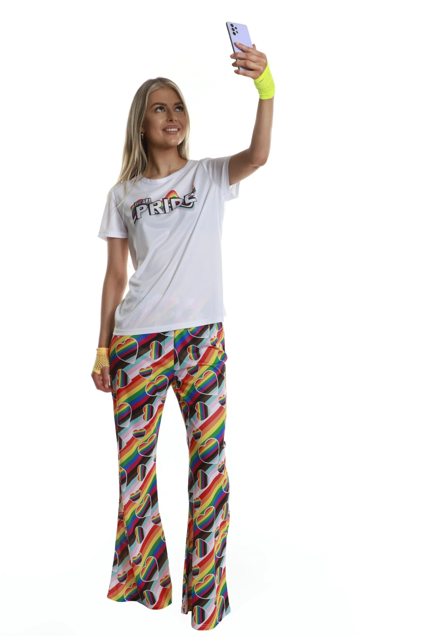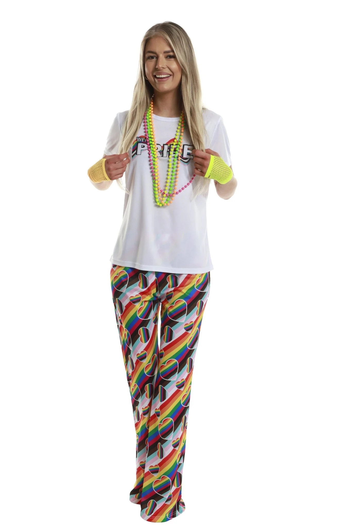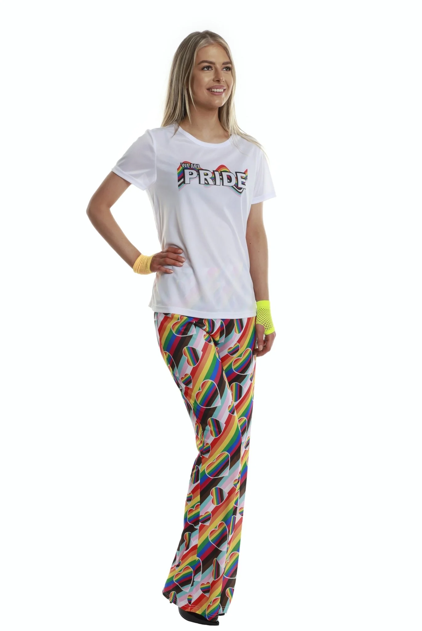 PRODUCT INCLUDES: Rainbow flared pants with love heart print.